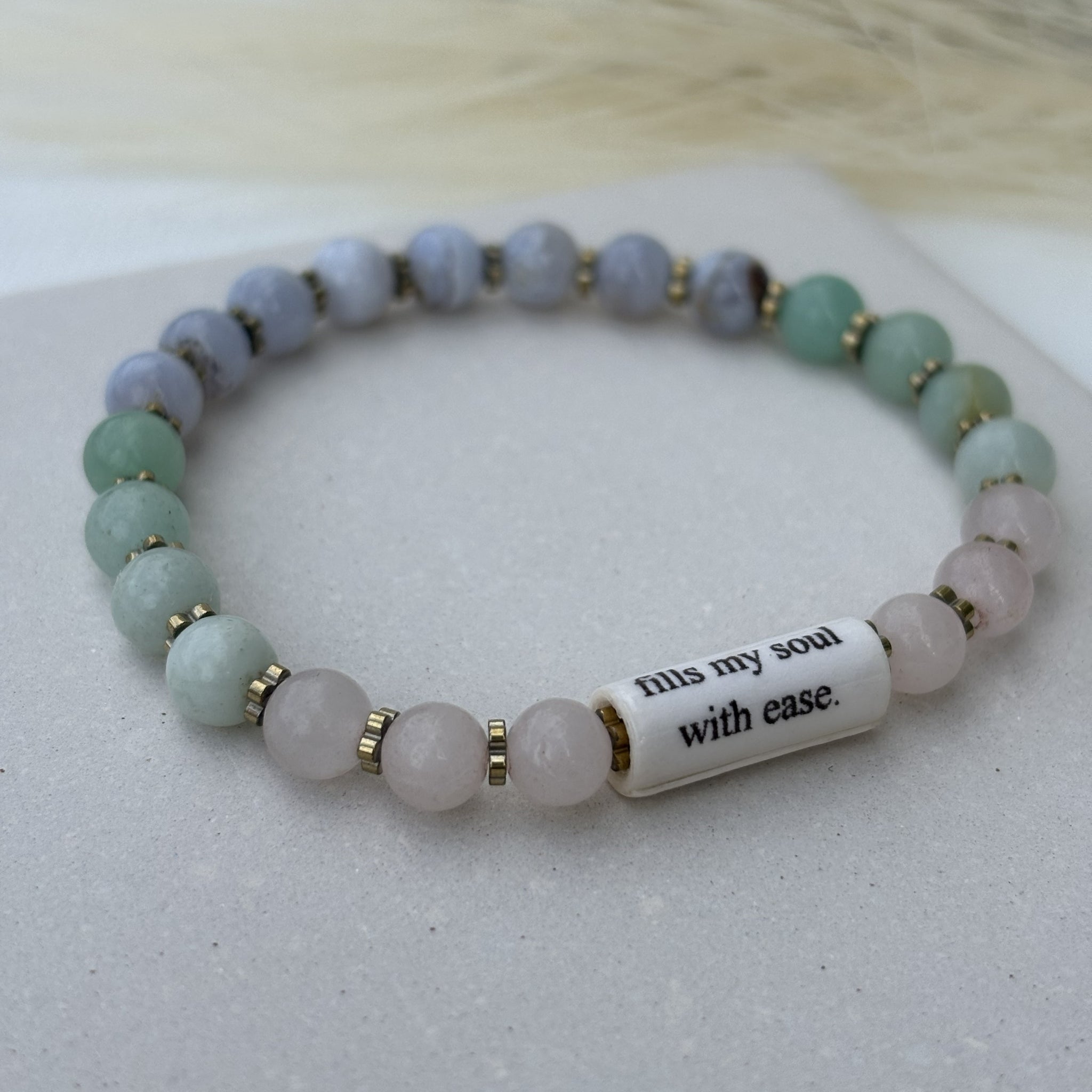 Invite calm, balance, and inner ease into your day. This bracelet combines Blue Lace Agate, Rose Quartz, Amazonite, Hematite, and a handcrafted paper word bead to support relaxation, emotional harmony, and grounding.